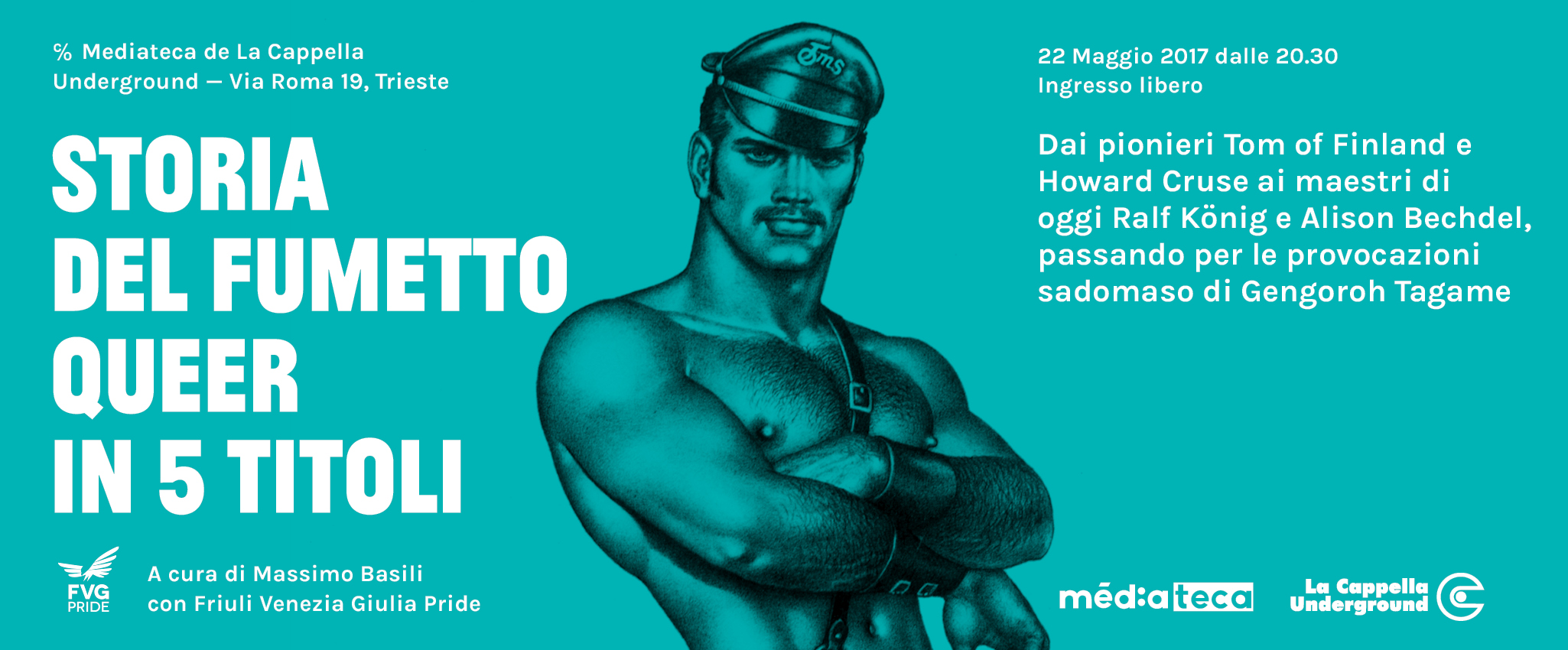 Un breve incontro che vuole essere una sintesi introduttiva di quello che è un panorama vasto e variegato. Partendo da 5 famosi titoli (Kake di Tom of Finland, Figlio di un preservativo bucato di Howard Cruse, Super Paradise di Ralf Koenig, Fun Home di Alison Bechdel e Racconti estremi di Gengoroh Tagame), Massimo Basili, ci offrirà una panoramica su quello che è il fumetto LGBTQIA.