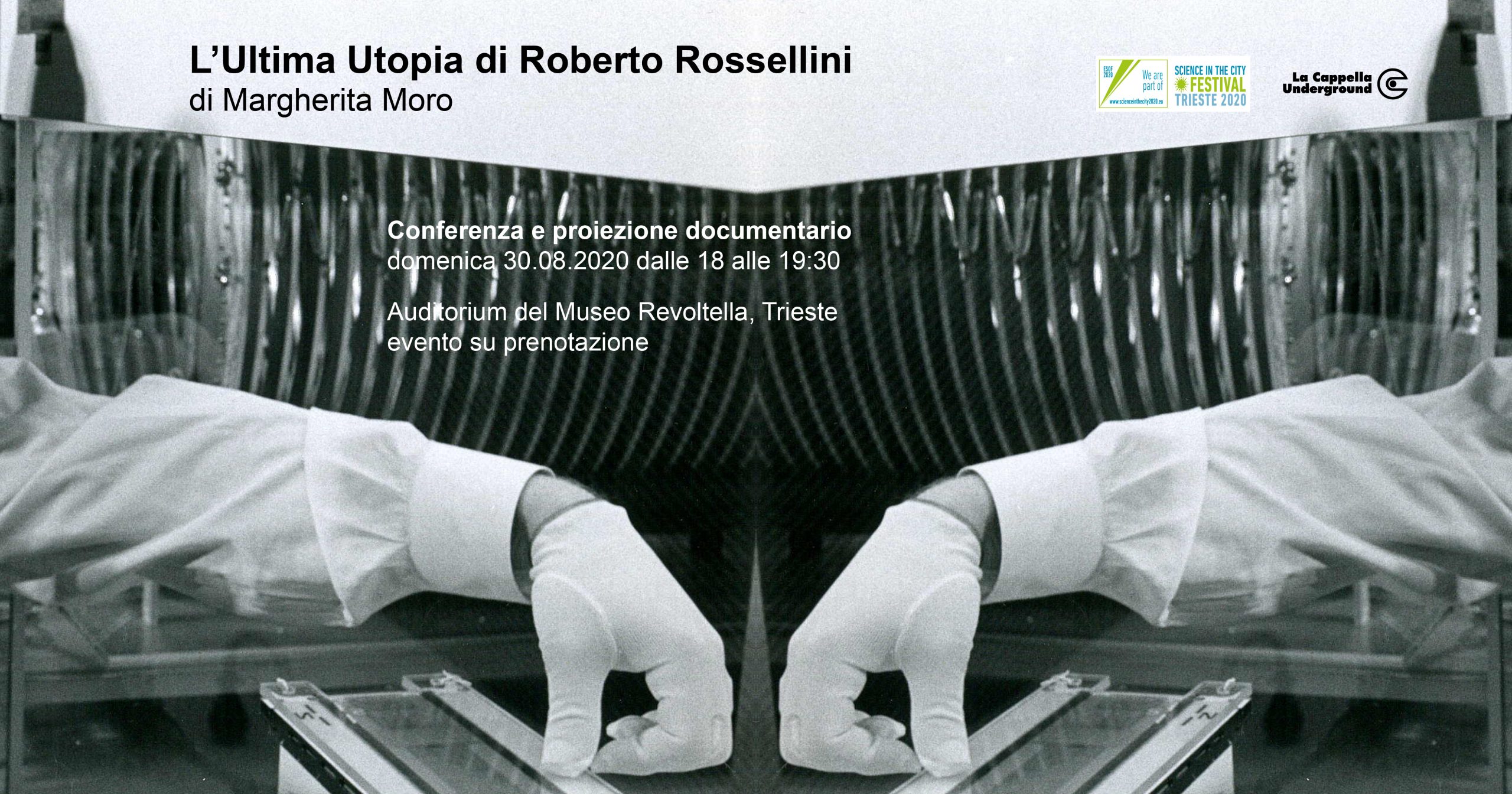 Domenica 30 agosto alle 18.00 all’auditorium del Museo Revoltella il Science in the City Festival di ESOF 2020 Trieste in collaborazione con La Cappella Underground presenta L’ULTIMA UTOPIA DI ROBERTO ROSSELLINI, un documentario originale realizzato da Margherita Moro incentrato su “Science”, titolo che avrebbe dovuto avere uno degli ultimi lavori inediti del grande regista italiano, pioniere della divulgazione della scienza attraverso al televisione. La proiezione sarà accompagnata da una conferenza a cura dell’autrice.