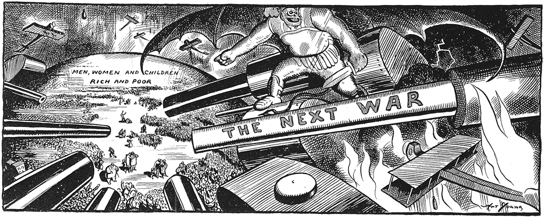 Questa danza macabra produce per reazione notevoli esempi di arte critica politica che anche a distanza di anni rimane tristemente attuale e significativa. Tra gli ottimi esempi va citato Art Young, autore statunitense che a inizio del secolo scorso si distinse come cartoonist pubblicando sul The Saturday Evening Post ma soprattutto comparendo su The Masses, rivista indipendente di sinistra portatrice sana della poetica irriverente del Greenwich Village newyokese ed altamente attiva nel proprio contesto sociale.