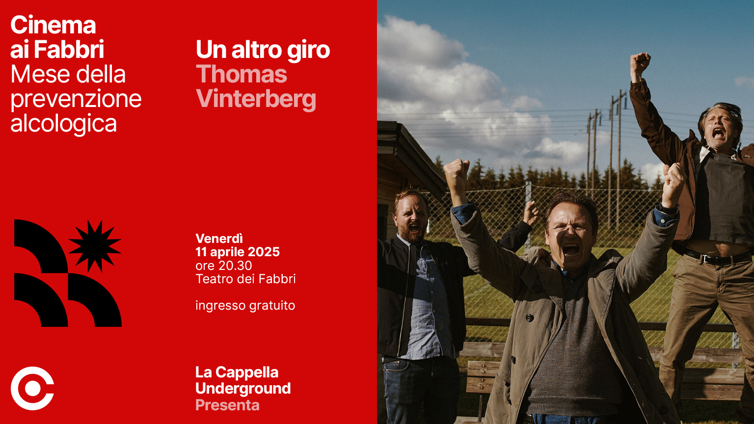 Dal 2001 aprile è il mese in cui si vuole porre l’attenzione sulla prevenzione delle tematiche alcol correlate attraverso iniziative di sensibilizzazione e promozione del tema in tutto il territorio nazionale. Anche quest’anno La Cappella Underground è coinvolta in una serie di iniziative promosse dall’Area delle Dipendenze del Dipartimento Dipendenze e Salute Mentale di ASUGI. In programma una proiezione INGRESSO GRATUITO andrà ad arricchire il calendario degli eventi organizzati: venerdì 11 aprile alle 20.30 al Teatro dei Fabbri la proiezione di Un altro giro di Thomas Vinterberg. La proiezione è accessibile senza prenotazione fino a esaurimento dei posti disponibili.